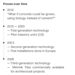 Mimmik Tile grows with the help of bacteria. Now in its third generation, the technology has matured into a stable and scalable production process. Produced by Biomason.